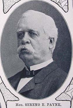 Sereno Payne was born in Hamilton, NY June 26, 1843, the son of the late William Wallace Payne, a farmer who was elected to the New York Legislature in 1858 and again in 1859. Sereno graduated from the University of Rochester in 1864, was admitted to the bar in 1866, and has since practiced law in Auburn with the firm Payne, VanSickle, and Payne. Mr. Payne was united in marriage in 1873 to Getrude Knapp of Auburn and has one son, William K Payne, who is the junior member of his law firm.